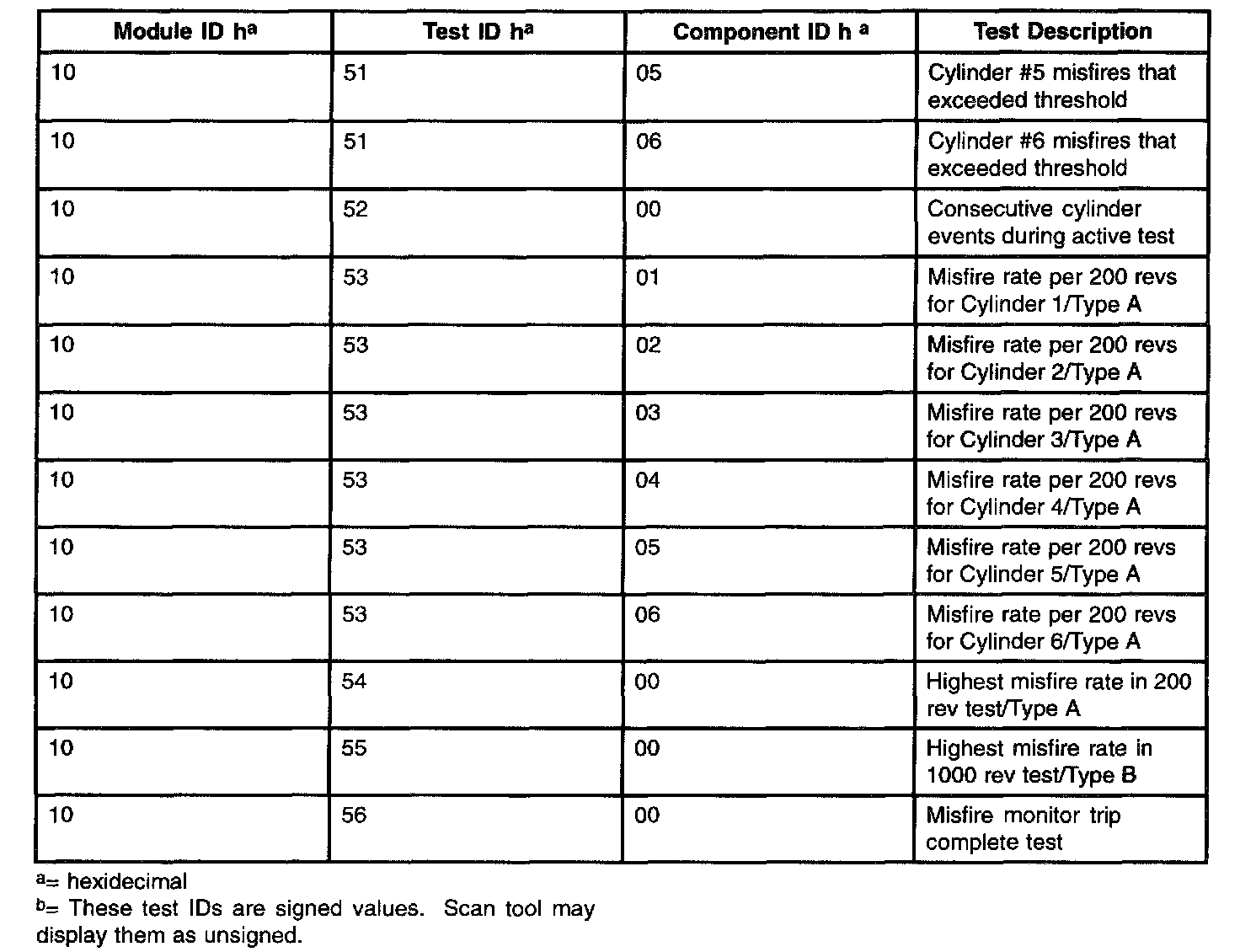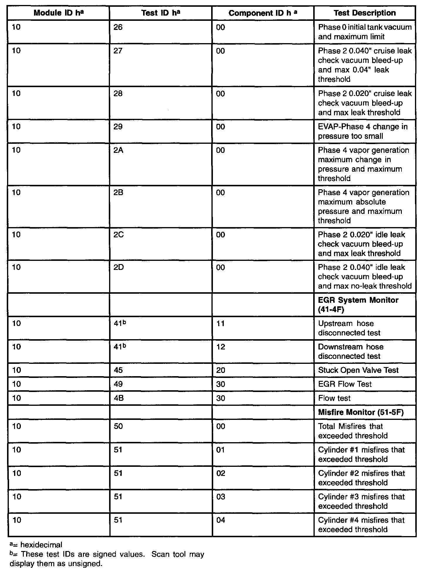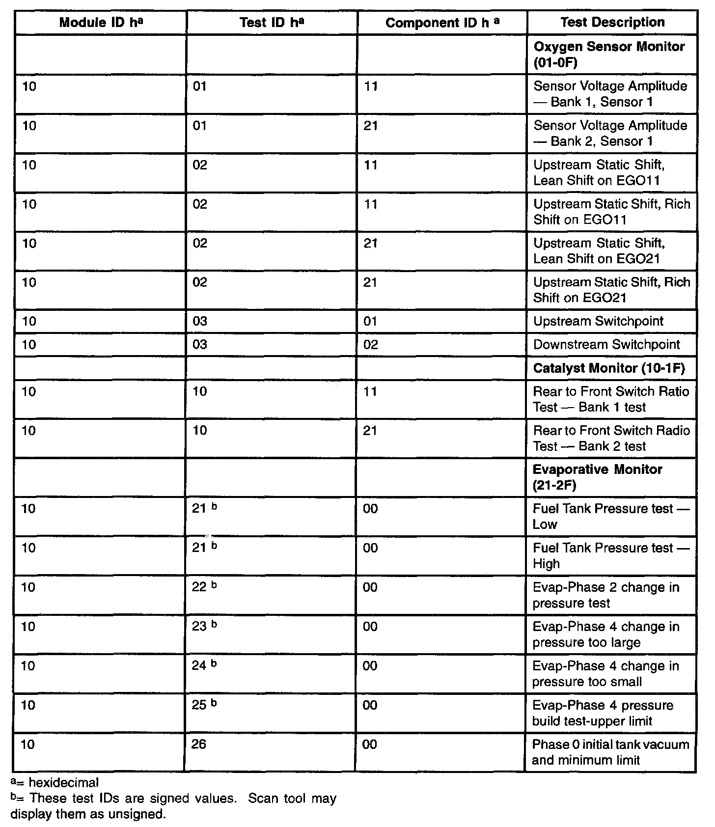 The purpose of this test mode is to allow access to the results of OBD II monitor diagnostic test results. The test values that are stored at the time of the particular monitor completion are displayed when the particular test identification is requested. Refer to the table for test information.