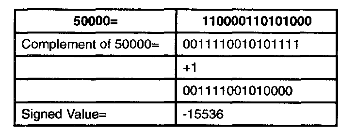 The conversion is done as follows: If the value is >32767 then complement (change 0's to 1's and 1's to 0's), add 1 and a negative sign.
