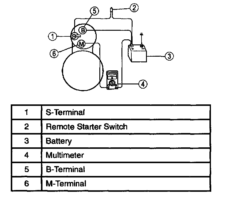8. Remove the cables from solenoid B-, S- and M-terminals. Clean the cables and connections and reinstall the cables to the proper terminals. Repeat Steps 3 through 6. If the voltage drop reading is still greater than 0.5 volts when checked at the M-terminal or less than 0.5 volts when checked at the B-terminal, the concern is in the solenoid contacts. Replace the starter motor.