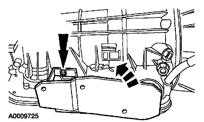 Note: If equipped, the transmission servo heat shield needs to be unclipped from the fluid pan rail and positioned out of the way for fluid pan removal.