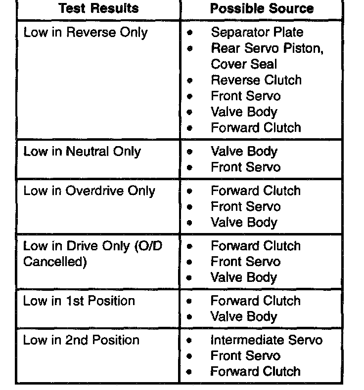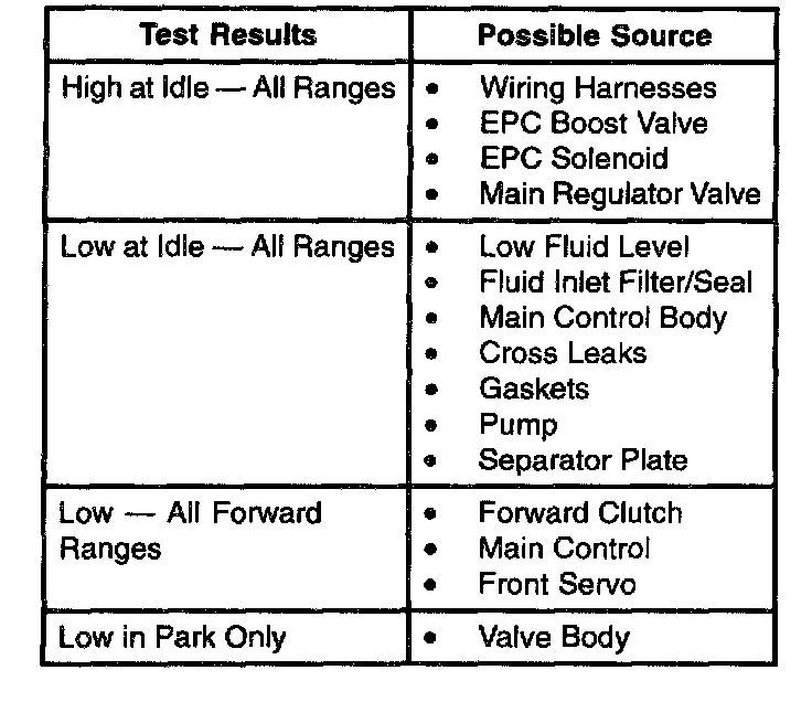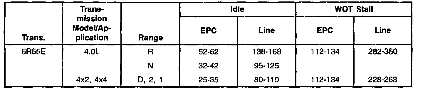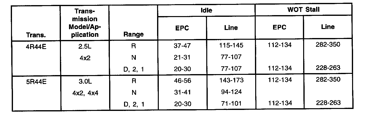2. Start engine and check line pressures. Refer to the following Pressure chart to determine if line pressure is within specifications.