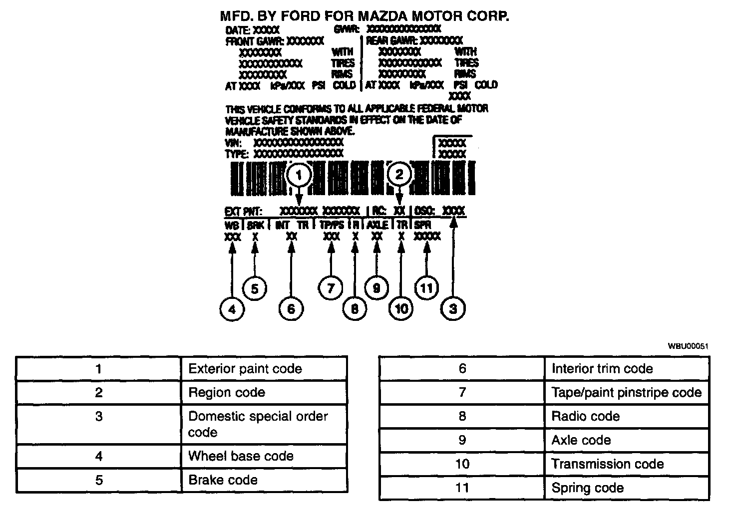 The vehicle certification (VC) label contains the manufacturer name, the month and year of manufacture, the certification statement, and the VIN. It also includes gross vehicle weight ratings (GVWR).