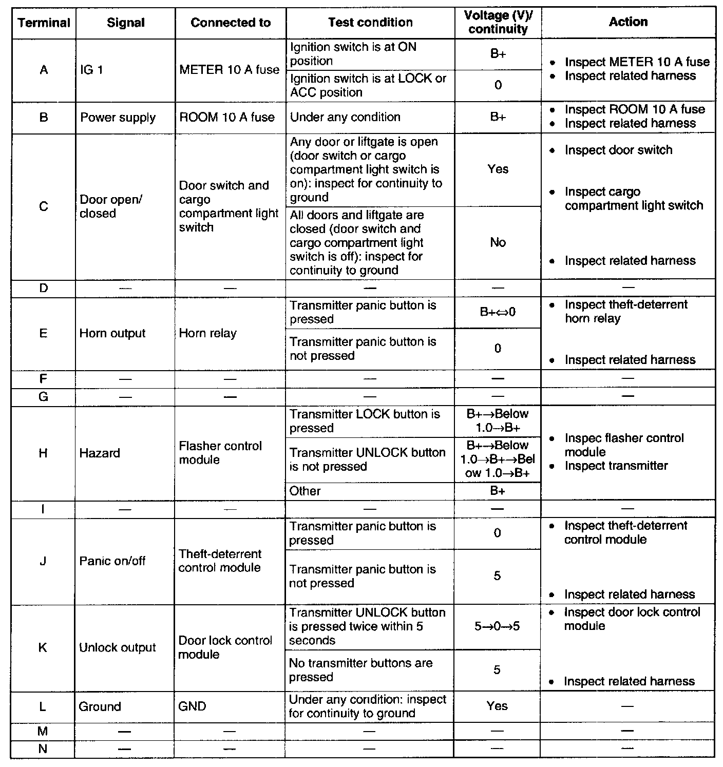 KEYLESS CONTROL MODULE INSPECTION1. Measure the voltage at the keyless control module terminals as indicated below.