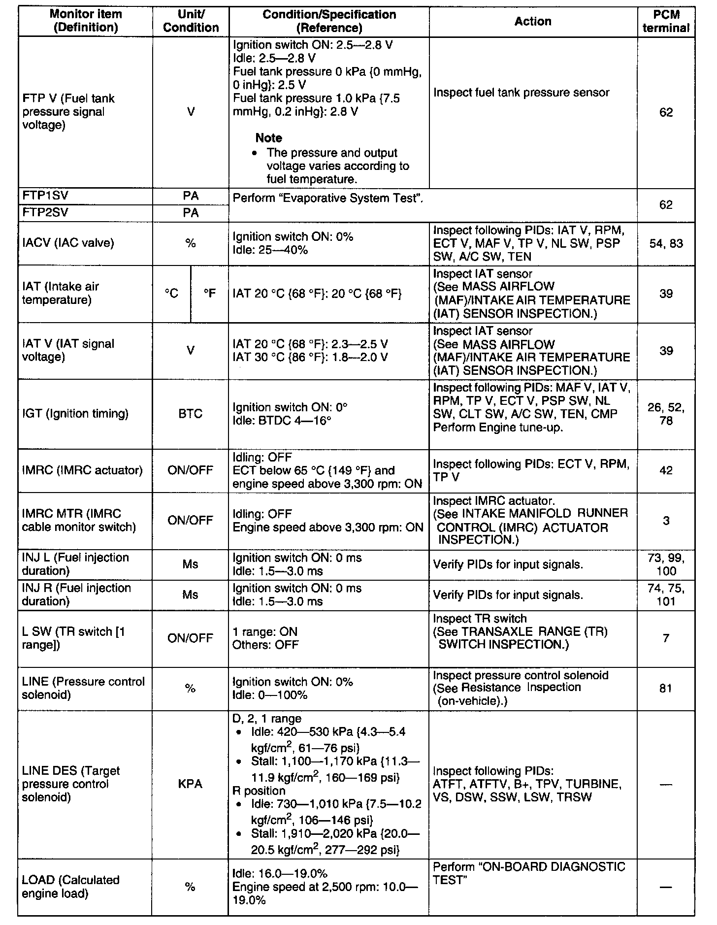 - If PID value is not within the specification, follow the instructions in Action column.