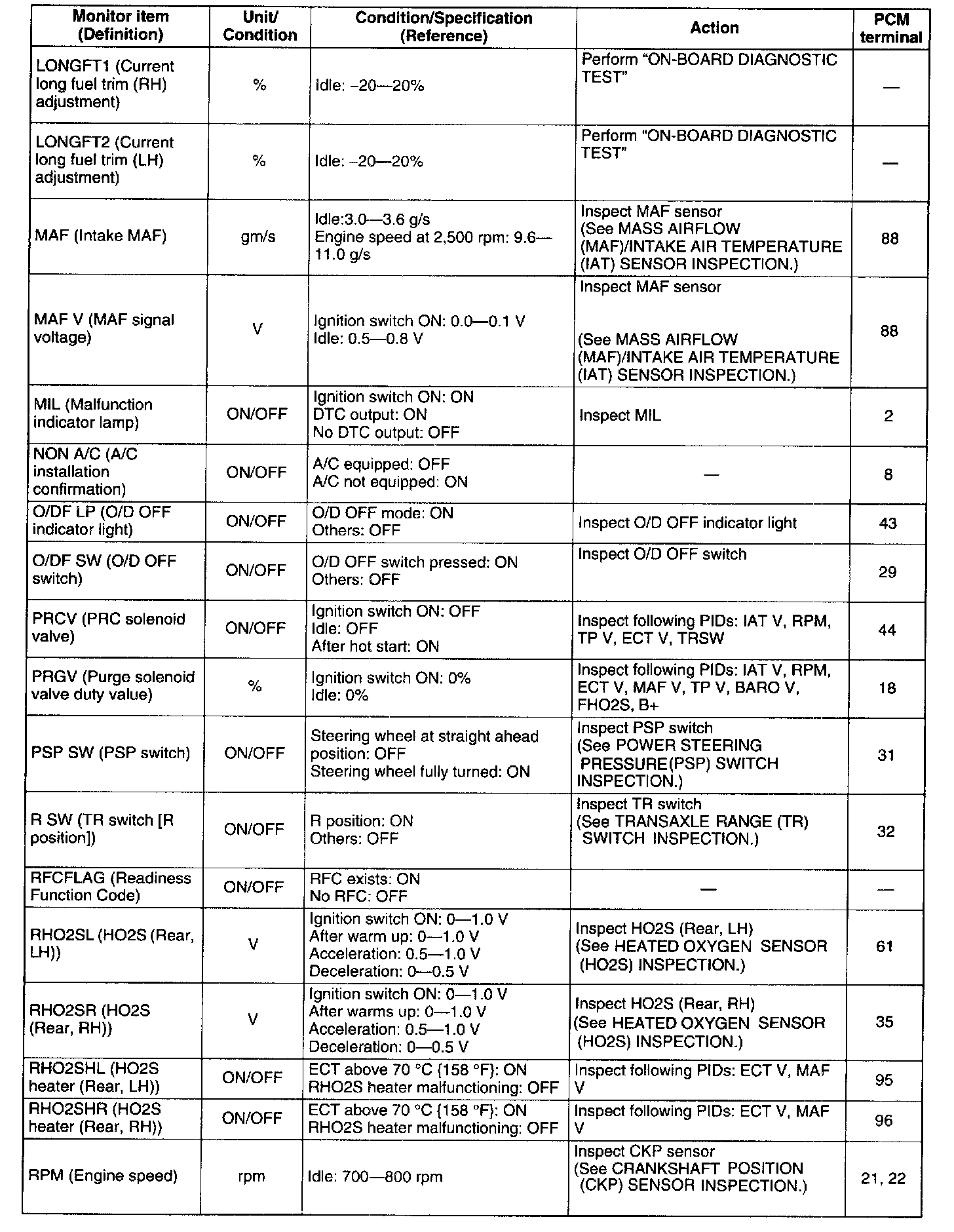 PID/DATA MONITOR table (Reference)
