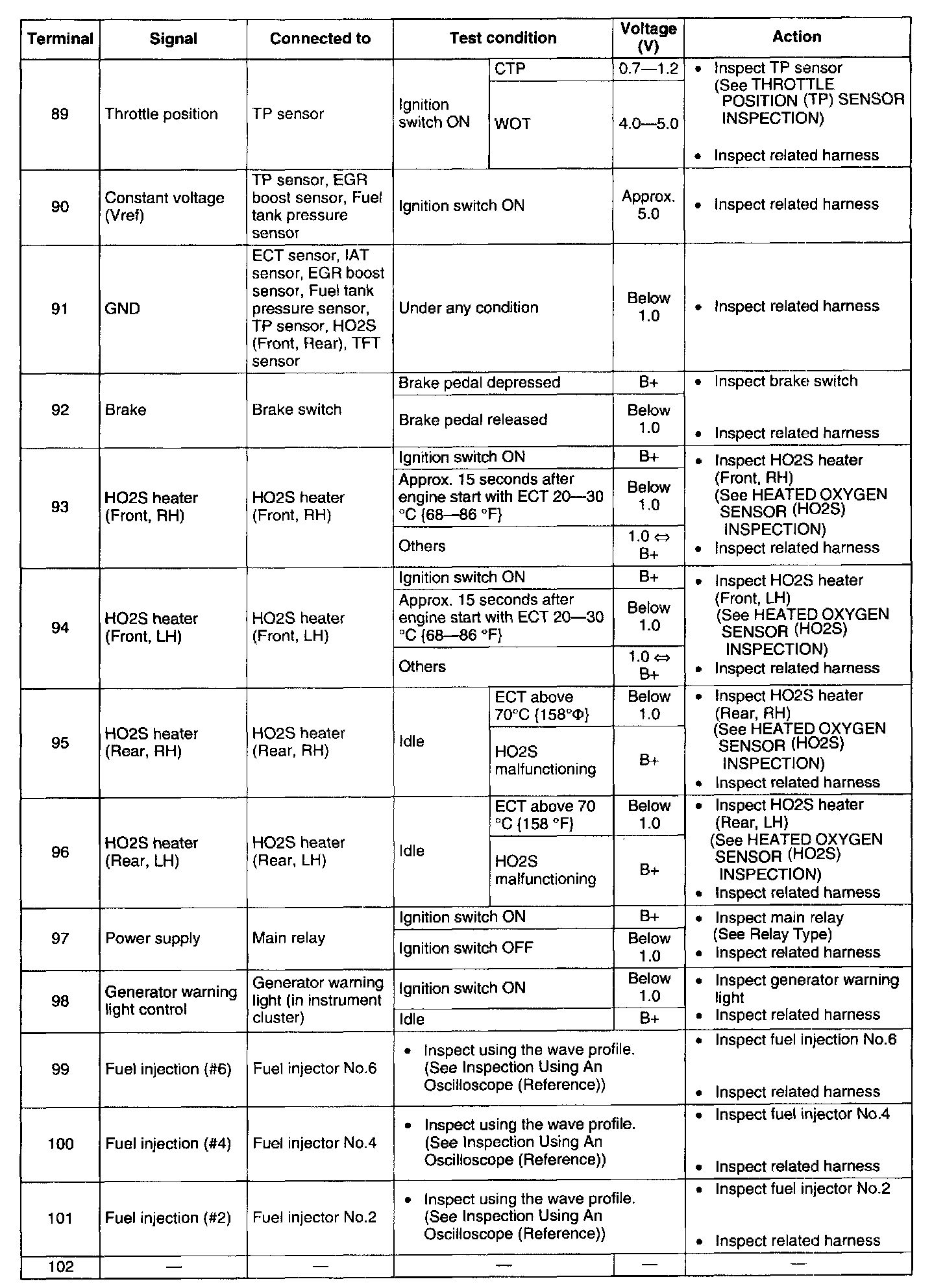 Terminal Voltage Table (Reference) - Terminal 89 - 102: