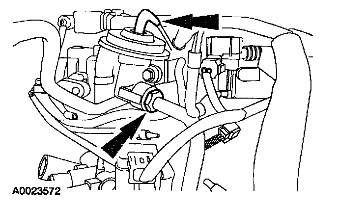 5. Disconnect the exhaust gas recirculation (EGR) valve vacuum hose and EGR tube nut.