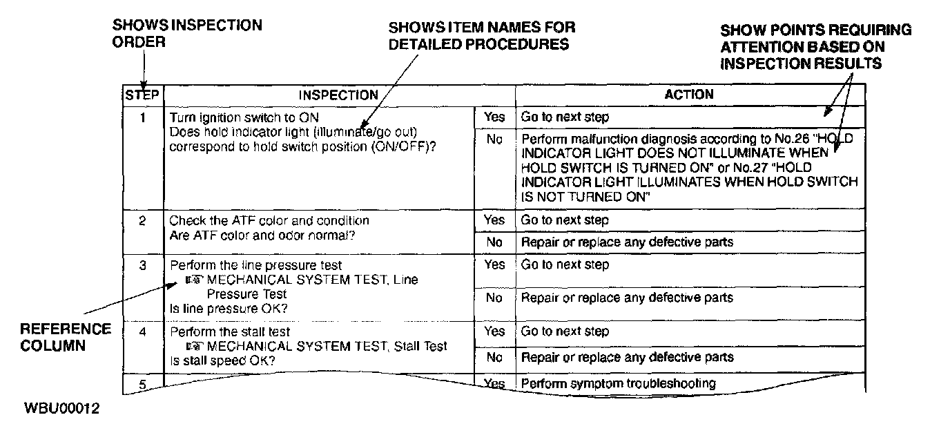 - Although inspections and adjustments are performed according to the reference column procedures, if the cause of the malfunction is discovered during basic inspection, continue the procedures as indicated in the remarks column.