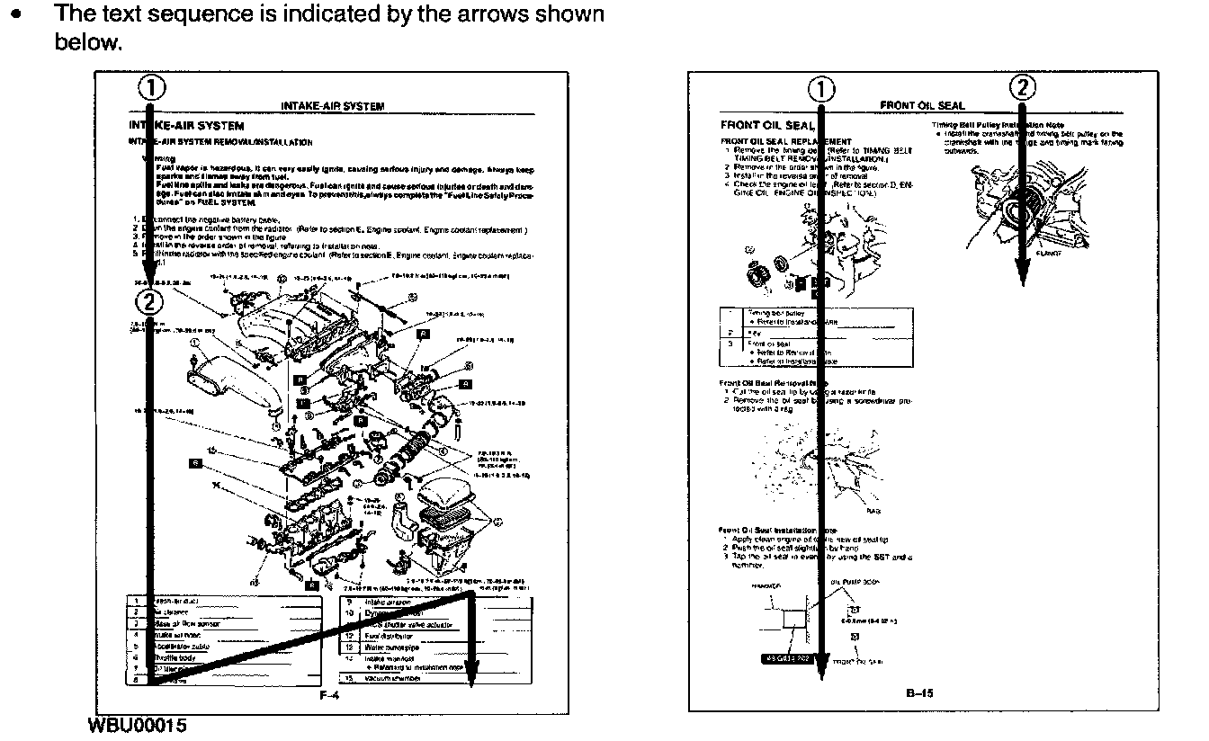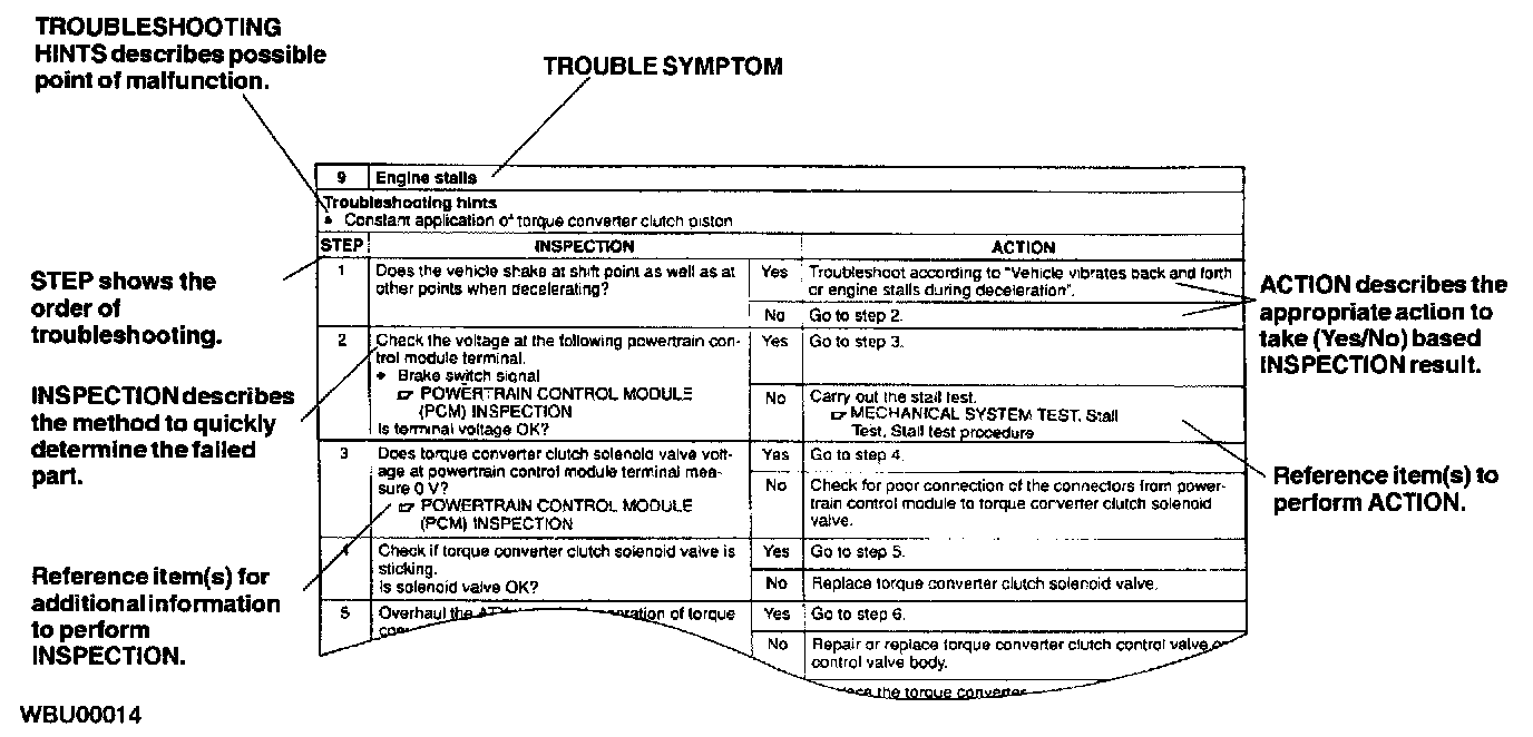 - Symptom troubleshooting shows diagnostic procedures, inspection methods, and proper action to take for each trouble symptom.