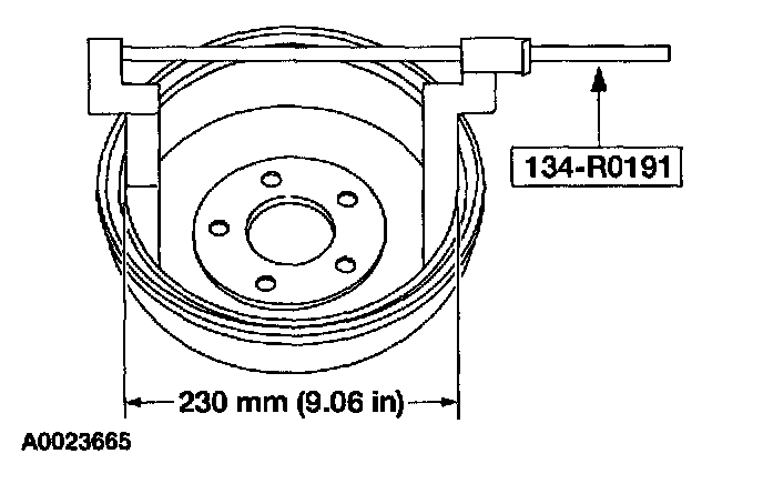 3. Using the special tool, measure the braking surface diameter. If the inside diameter measures more than the maximum specification shown on the outside of the brake drum, install a new brake drum.