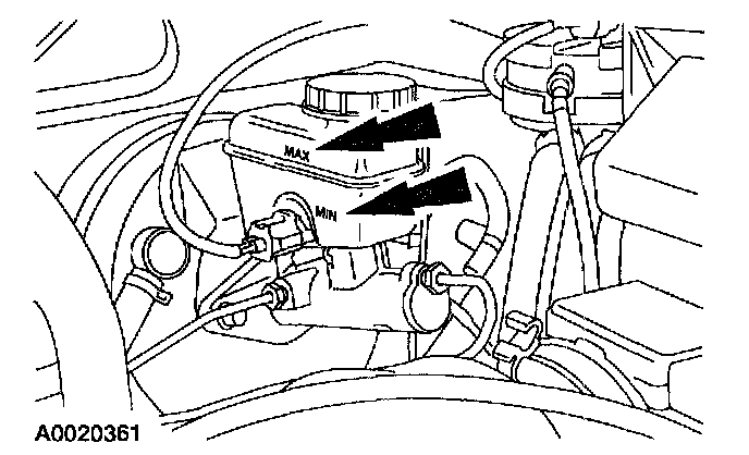 BRAKE SYSTEM LEAK CHECK1. Check the brake fluid level. If the fluid level is below the MIN line on the brake master cylinder degas bottle add the necessary amount of DOT 3 brake fluid.