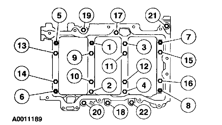 Caution: Fasteners No. 1, 5, 6, 7, 8 are studs. Fasteners No. 18-22 are M8 x 1.25 mm x 79.3 mm (0.05 in x 3.12 inch) bolts. Fasteners No. 2-4,17 are M8 x 1.25 mm x 95.3 mm (0.05 in x 3.75 inch) bolts. Fasteners 9-16 are M10 x 1.5 mm x 106 mm (0.06 in x 4.17 inch) bolts. The bolts and studs must be installed in the correct position or engine damage may result.