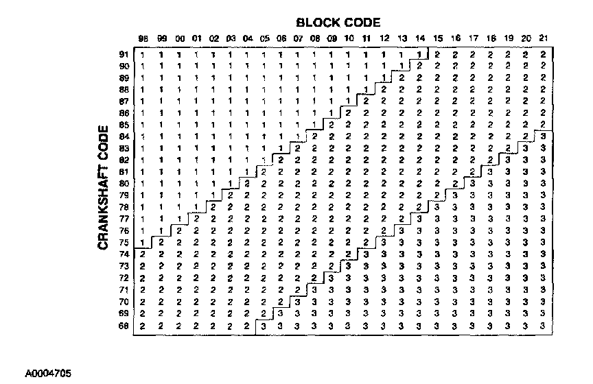 1. For example: If the block code is *0609*0711* and the crankshaft code is *8480*8082*, main. No. 1 should use grade 1 bearings, as determined by the intersection of the 06 block column and the 84 crankshaft row. Mains 2,3 and 4 should all be grade 2.