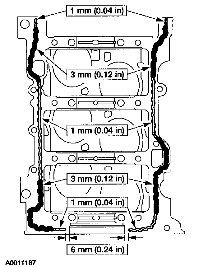 Caution: The lower cylinder block must be installed and the bolts tightened within four minutes of applying the sealant.