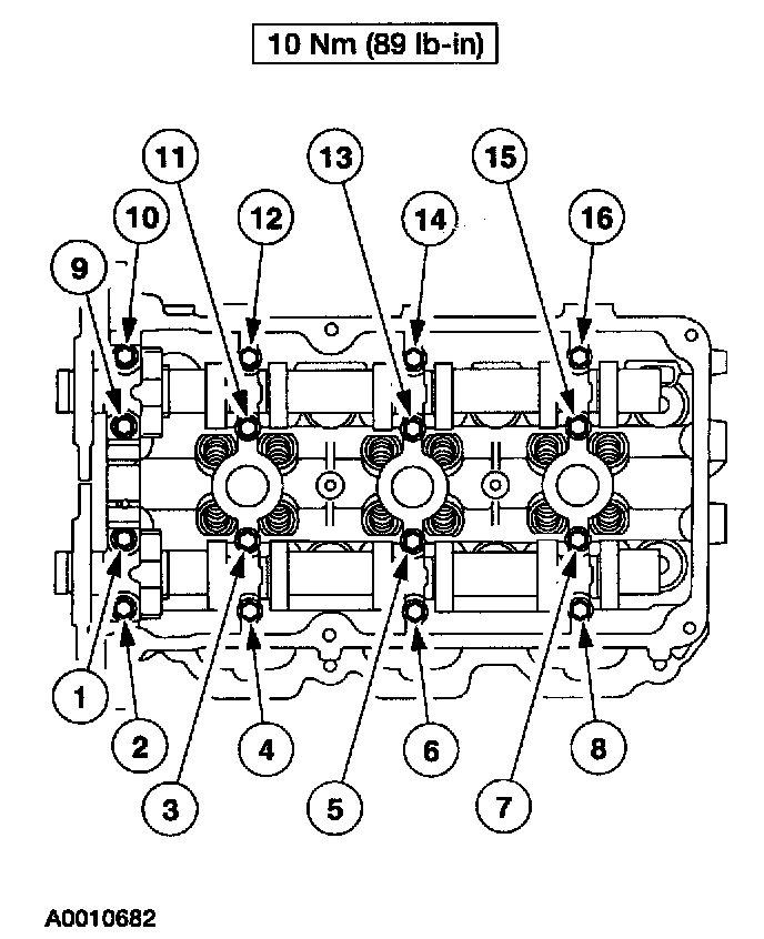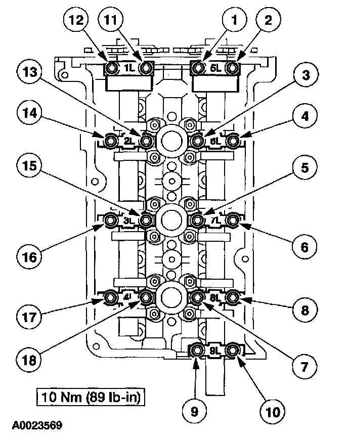29. Position the LH camshaft caps and install the bolt in the sequence shown.