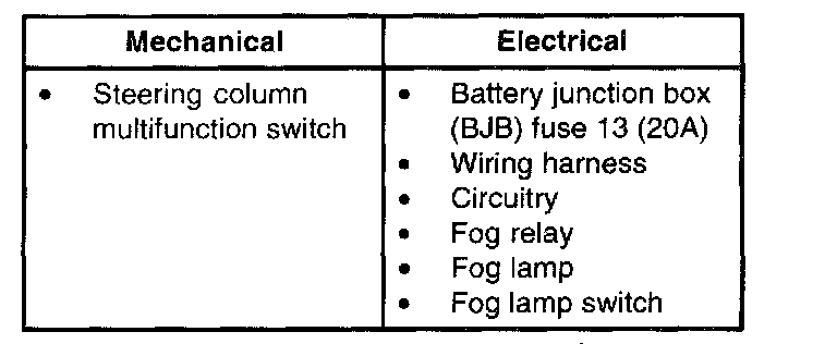 1. Verify the customer concern by operating the fog lamps.Visual Inspection Chart: