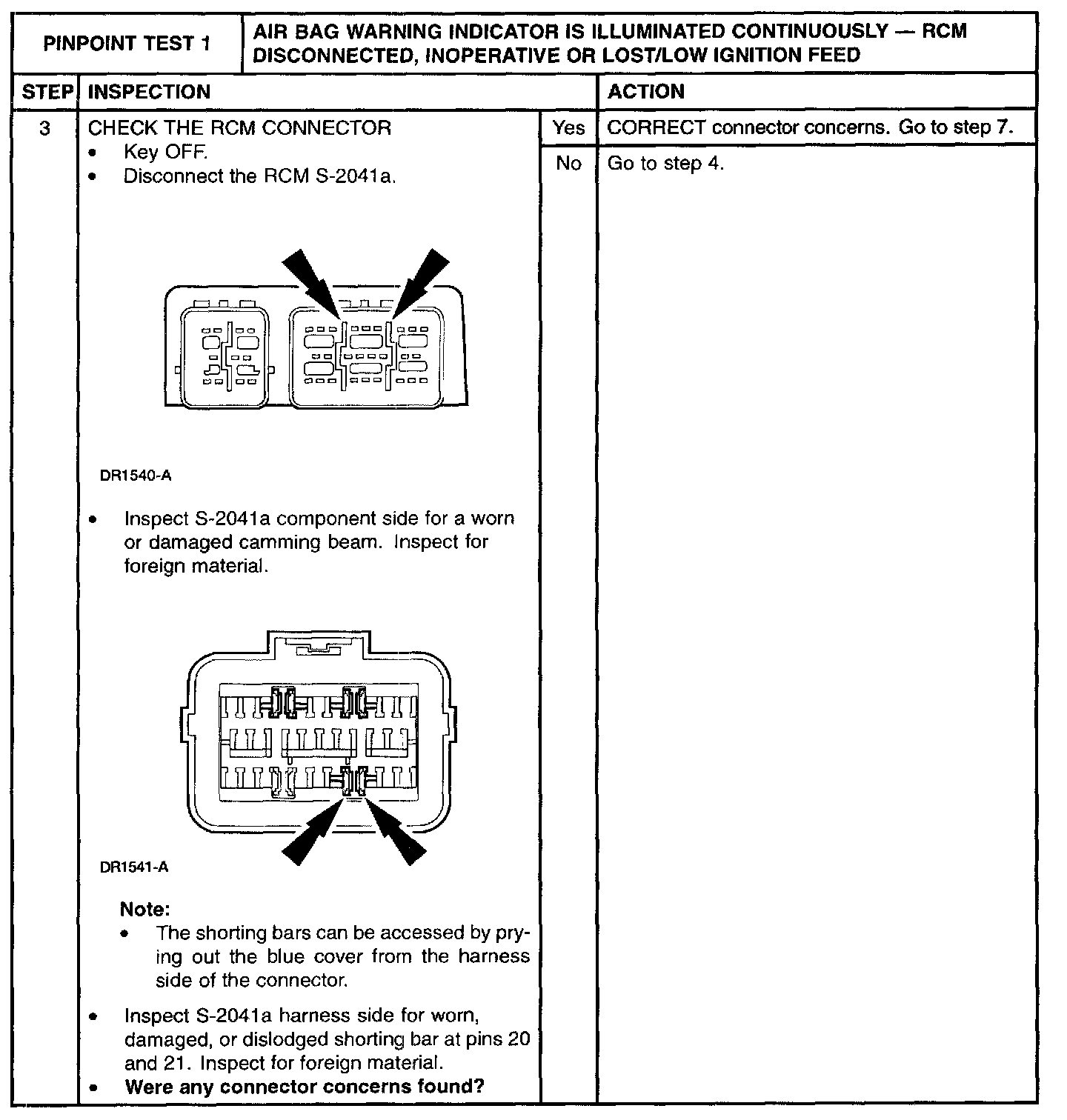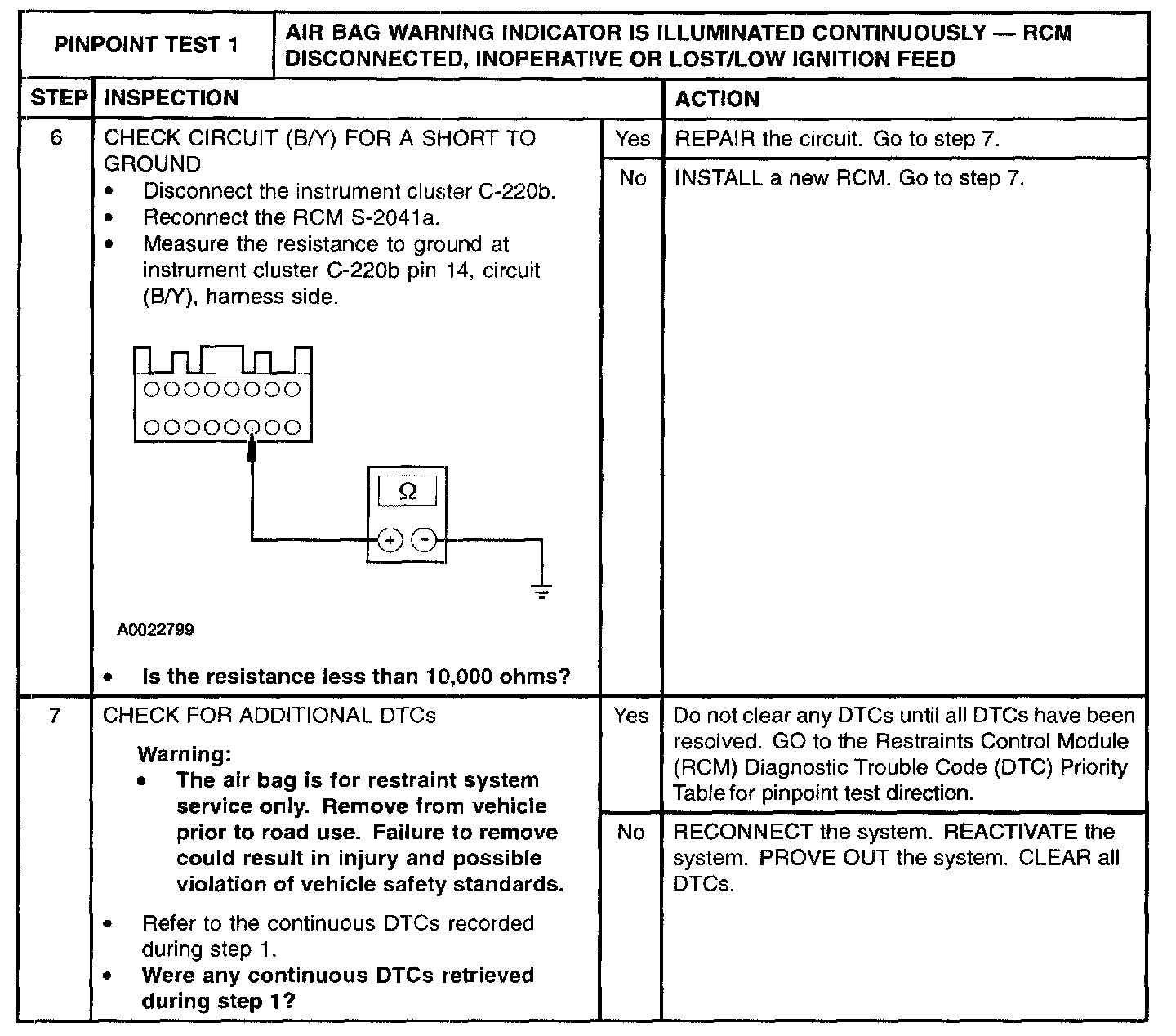 Pinpoint Test 1: Air Bag Warning Indicator Is Illuminated Continuously - RCM Disconnected, Inoperative or Lost/Low Ignition FeedNormal Operation