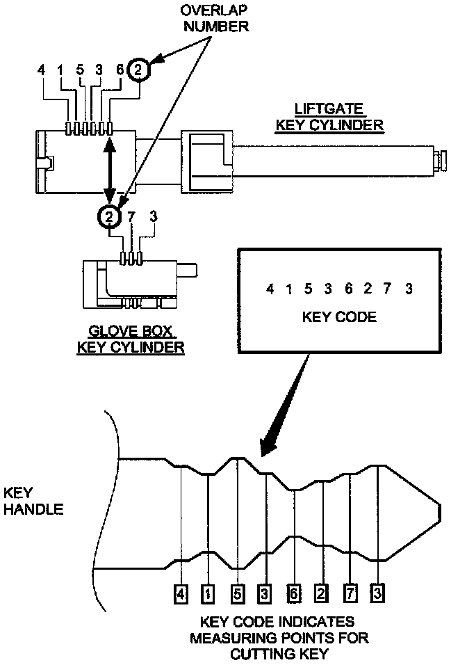 1. Line up liftgate key cylinder numbers and glove box key cylinder numbers in order starting from the key entry side of the cylinders, to obtain an eight digit number.