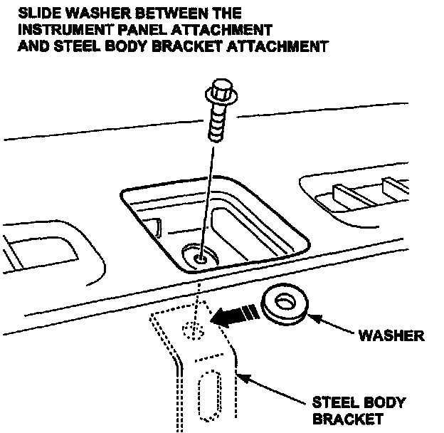 5. Add/slide washer between the Instrument Panel attachment and steel body bracket attachment. This will raise the Instrument Panel in the center.
