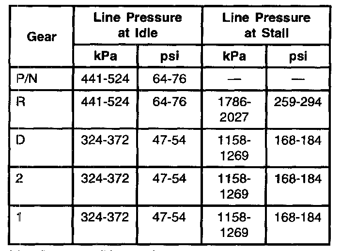 2. Start engine and check line pressures. Refer to Line Pressure Chart to determine if line pressure is within specifications.
