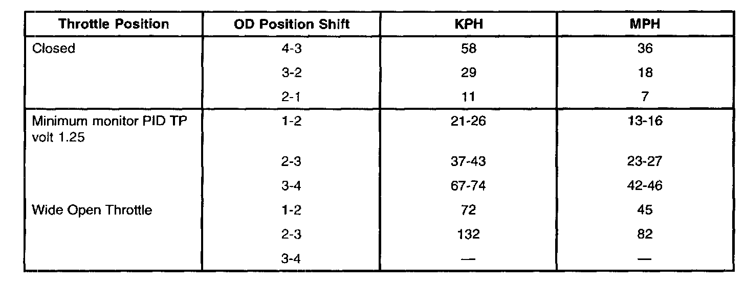 3. Apply minimum throttle and observe speeds at which upshift occurs and torque converter engages. Refer to Shift Speeds Chart in this Section (also refer to Automatic Transaxle specifications issue).