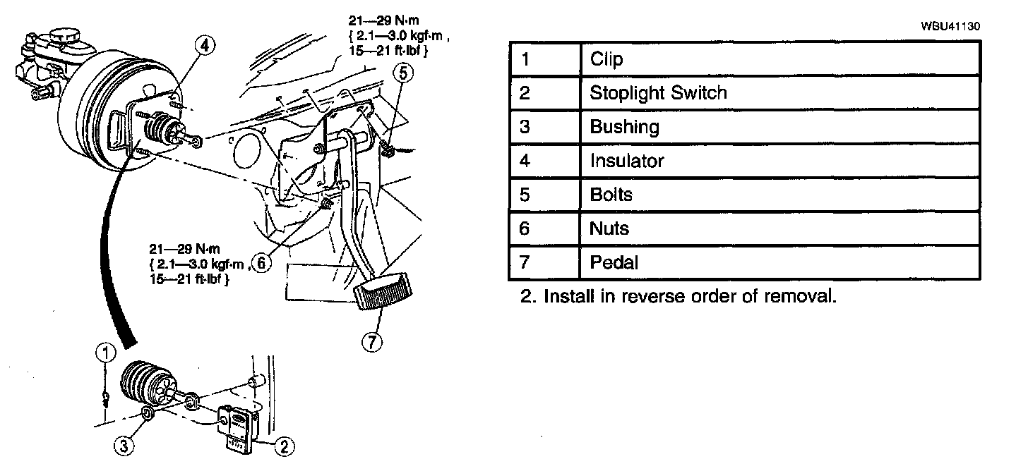 ^ When removing the stoplight switch, retain the bushing and hairpin clip. They will be required for installation.