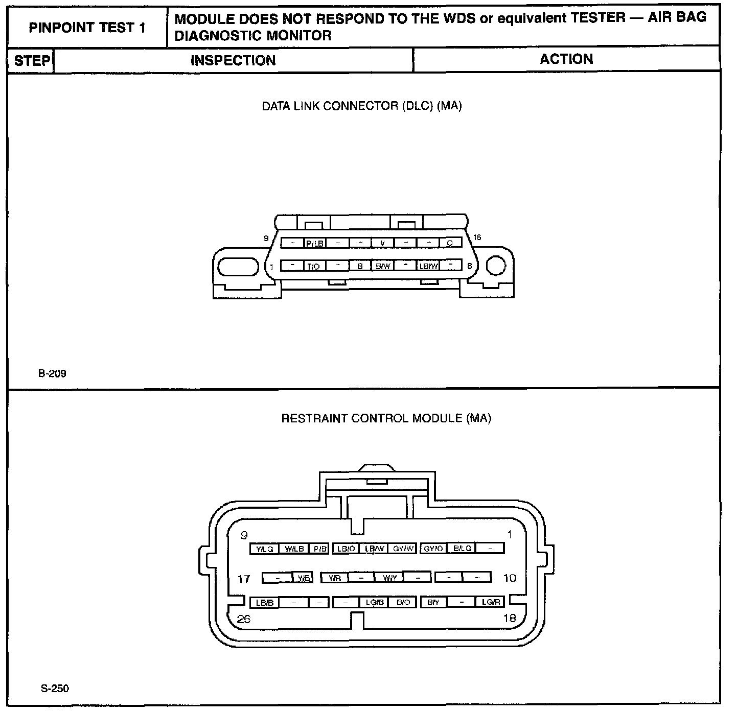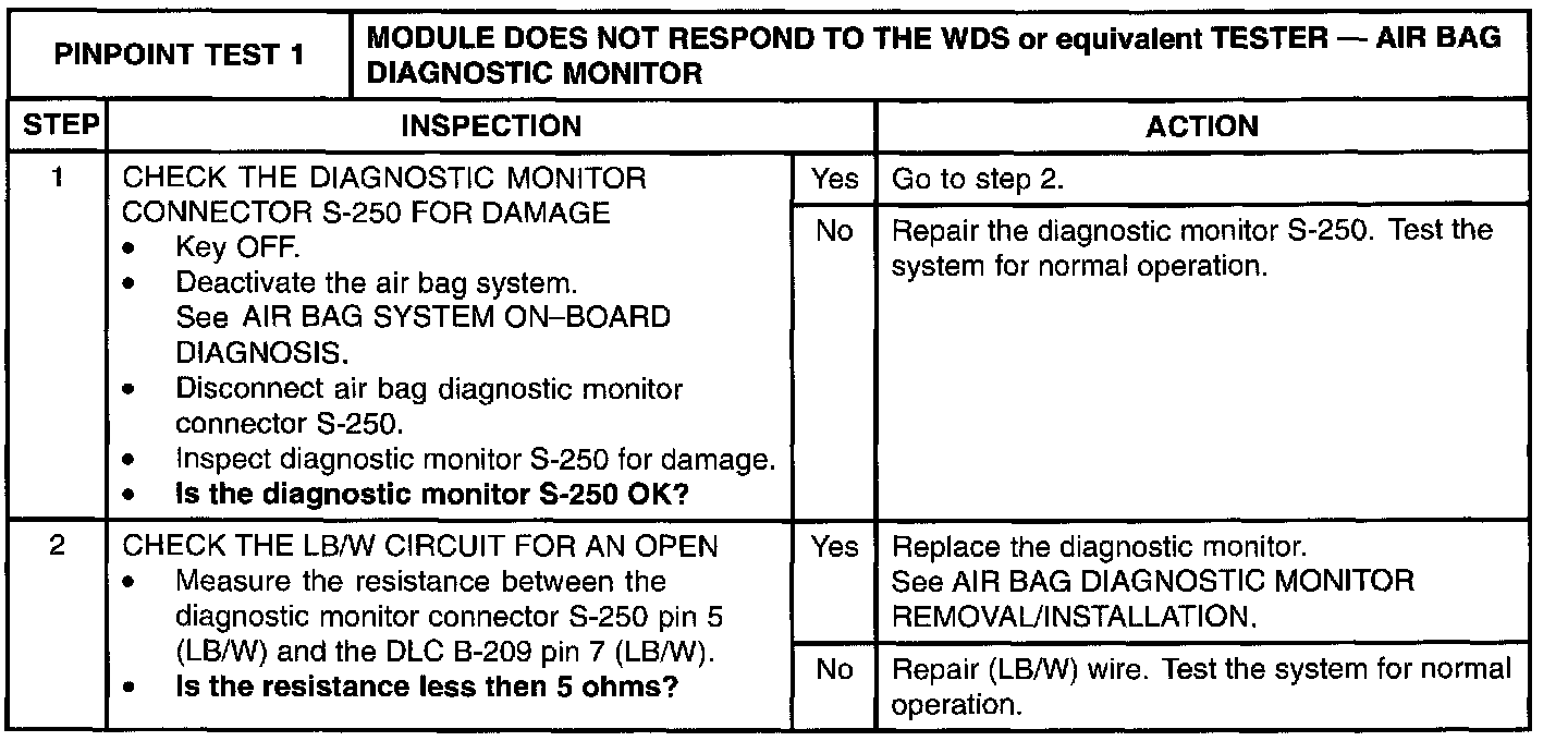 Pinpoint Test 1: Mod. No Resp, WDS Tester - Air Bag Diag. Mon.