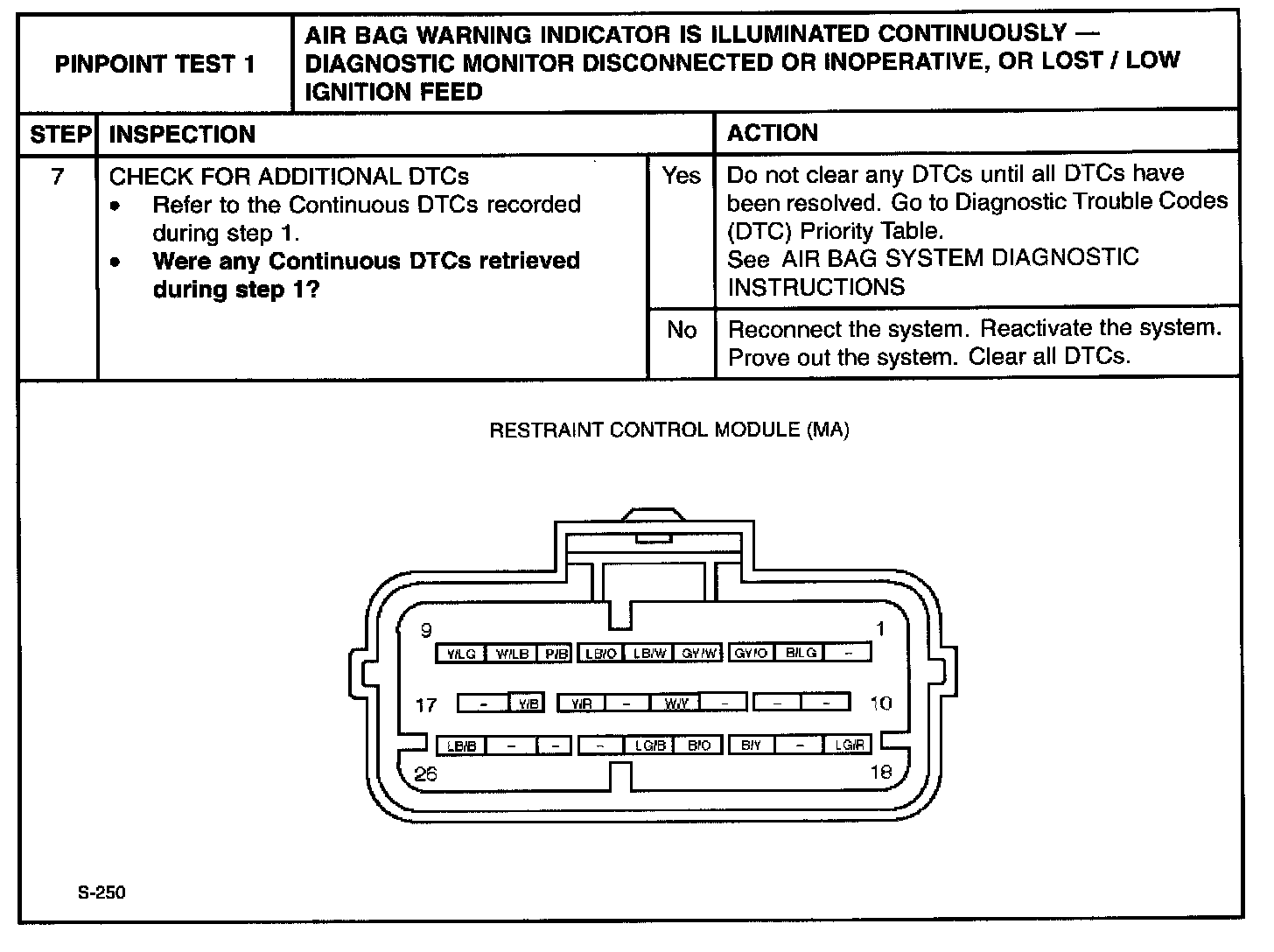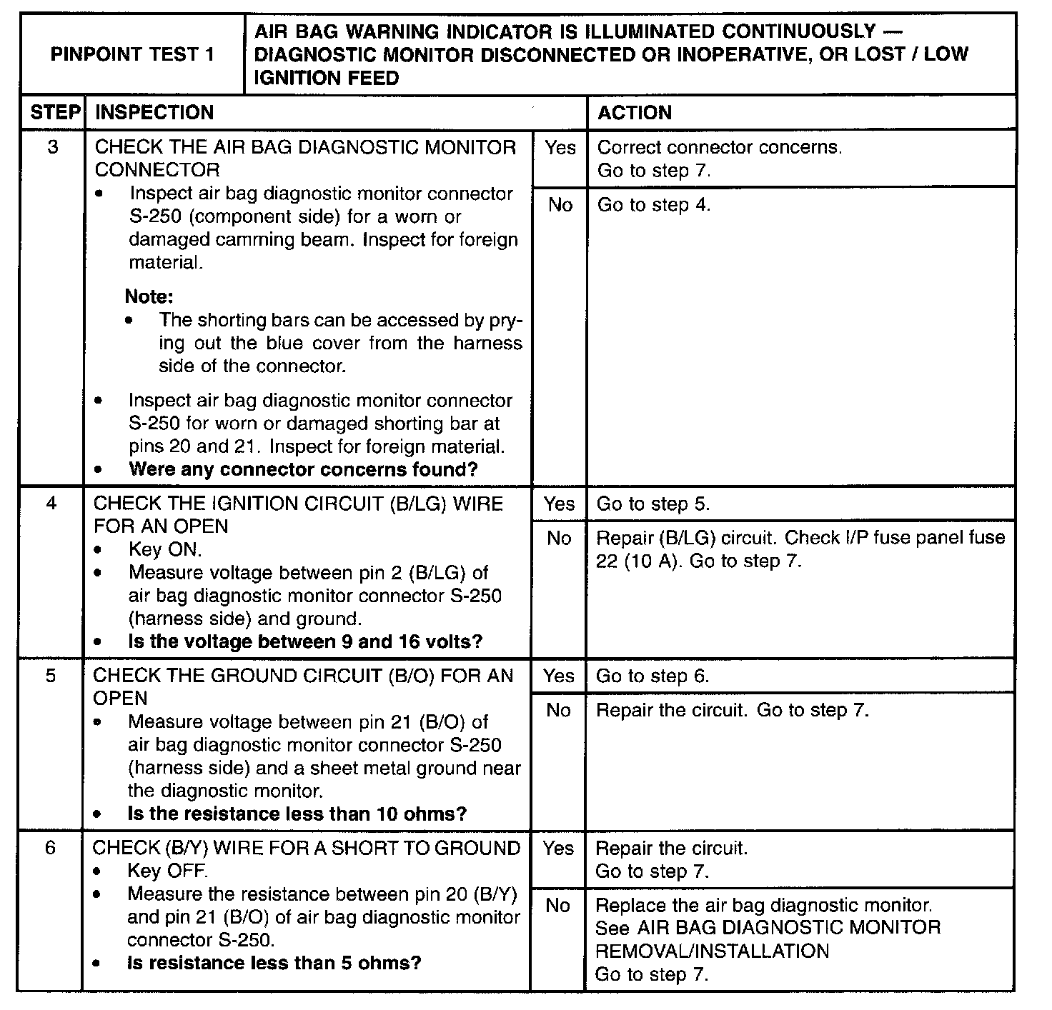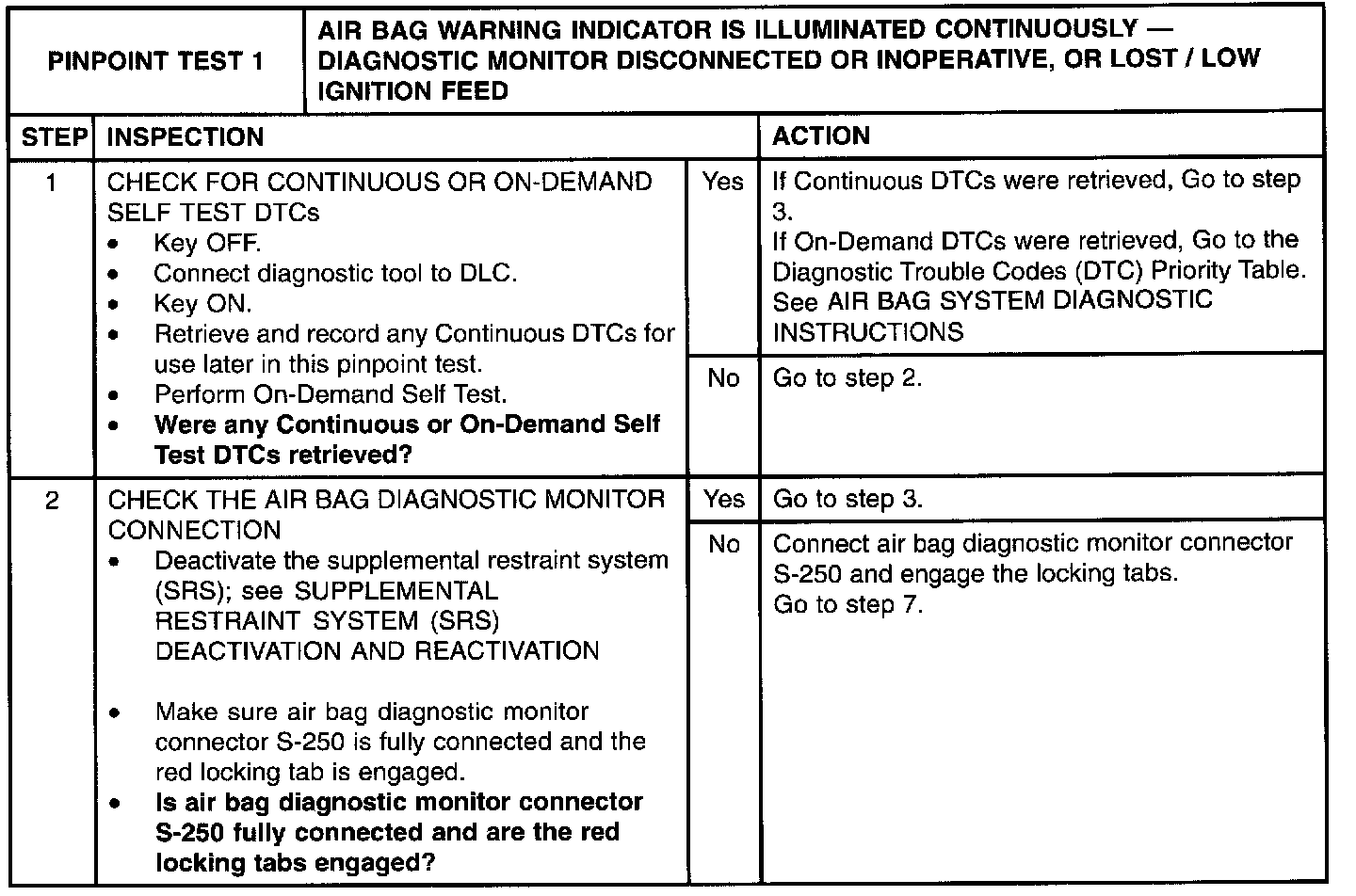 PINPOINT TEST 1: AIR BAG WARNING INDICATOR IS ILLUMINATED CONTINUOUSLY - DIAGNOSTIC MONITOR DISCONNECTED OR INOPERATIVE, OR LOST / LOW IGNITION FEEDNormal Operation