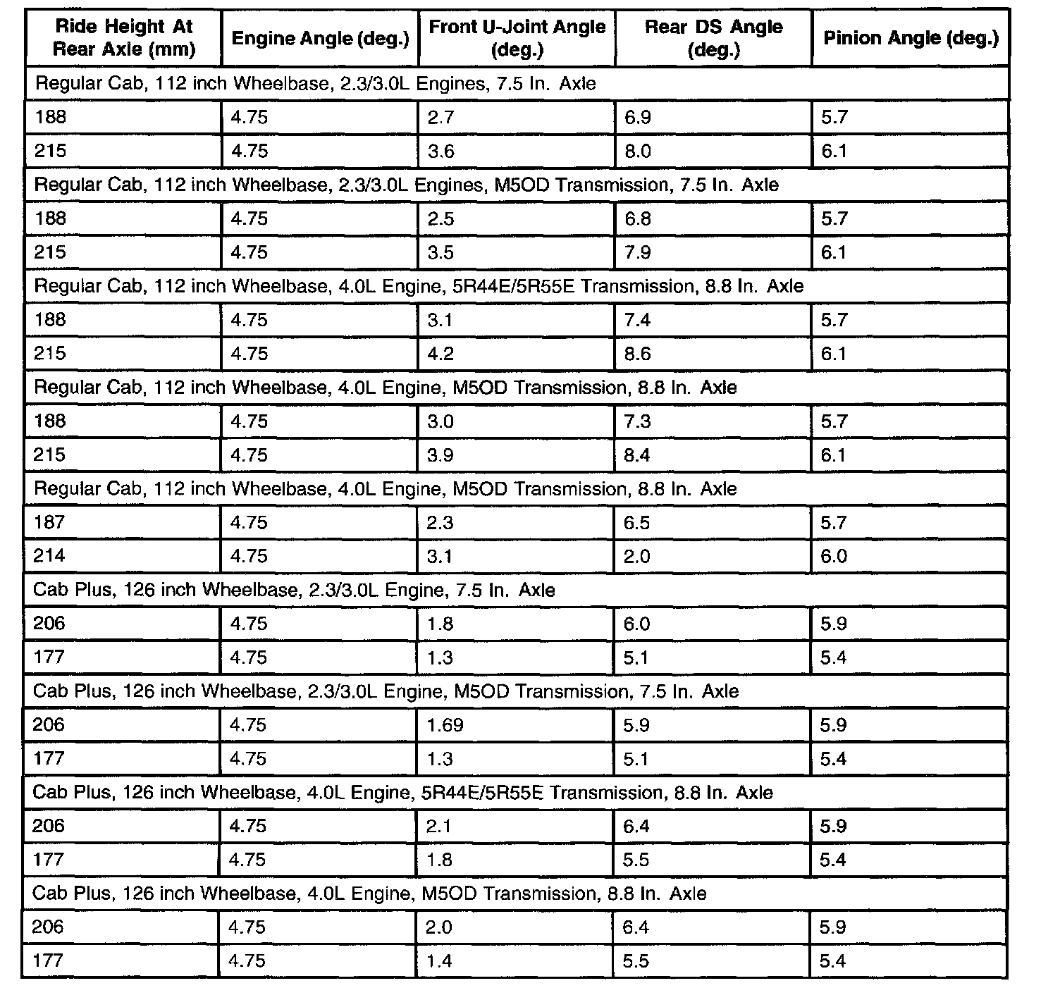 Rear Driveline Angles at Curb (4X2) Specifications