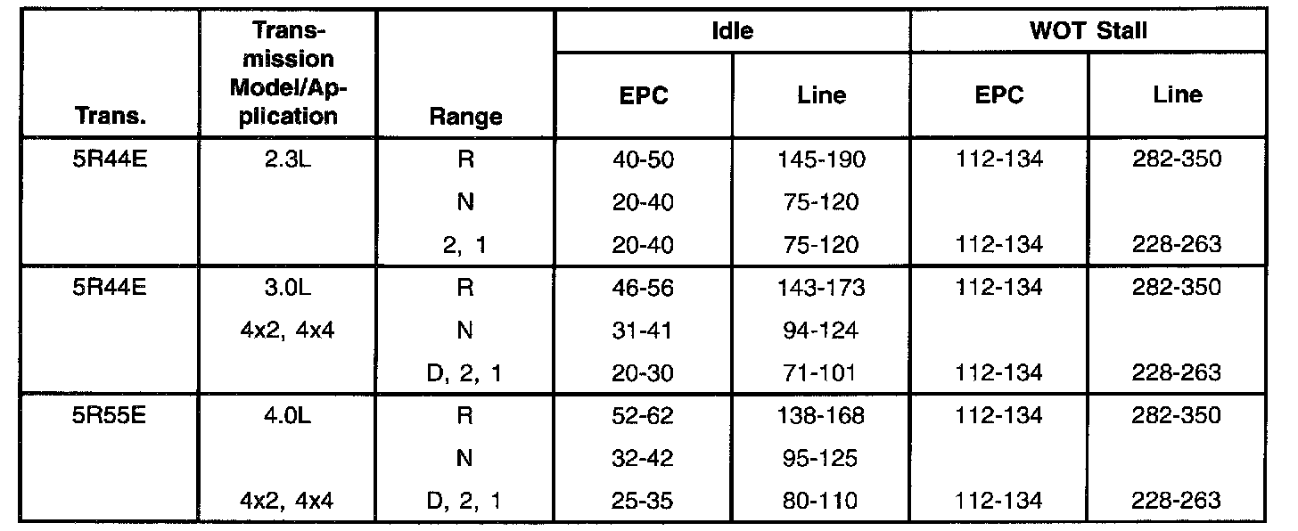 2. Start engine and check line pressures. Refer to the following Pressure chart to determine if line pressure is within specifications.