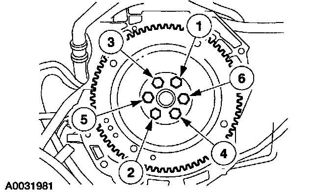 2. Install the flywheel or flexplate. Tighten the bolts in the sequence shown in three stages.