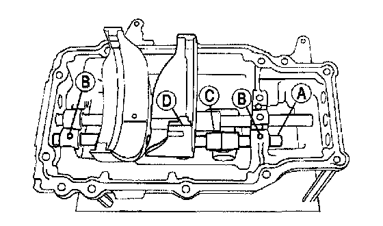 5. Position the (B) detent ball and spring, the (C) shift gate, the (D) shift fork and spring and install the (A) first/second shift rail.