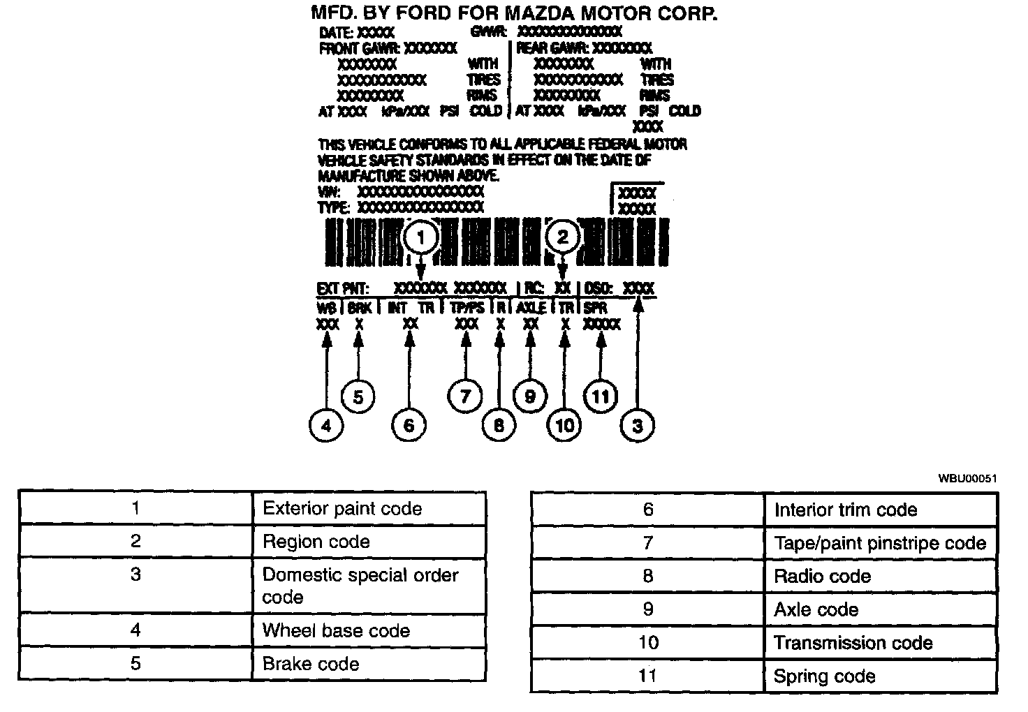 The vehicle certification (VC) label contains the manufacturer name, the month and year of manufacture, the certification statement, and the VIN. It also includes gross vehicle weight ratings (GVWR).