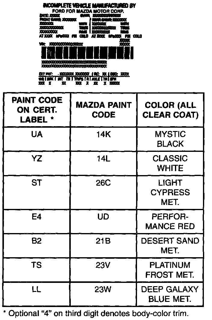 Interior trim codes are listed as a two-pan code. The first code listed identifies the trim level. The second code listed identifies the interior trim color.