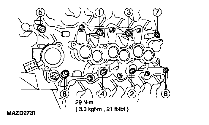 1. Install the bolts and tighten in the sequence shown.