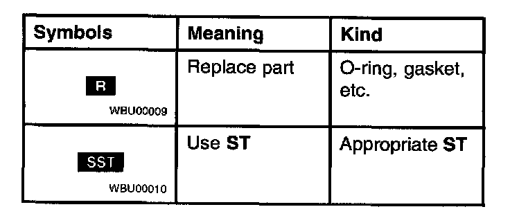 2. Expendable parts, tightening torques and symbols for oil, grease, and sealant are shown in the overview illustration. In addition, symbols indicating parts requiring the use of special service tools are also shown.
