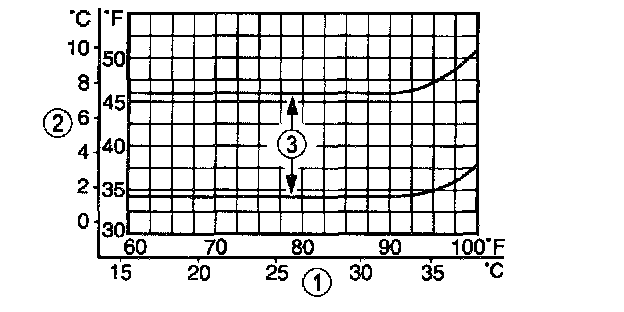 3. The system performance is acceptable when the center A/C register discharge temperature falls between the upper and lower limits shown.