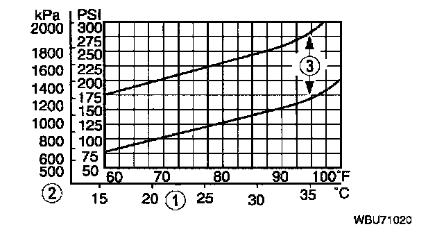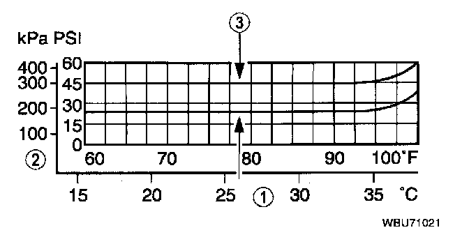 NOTE: In ambient temperatures between 38 °C - 43 °C (100 °F - 110 °F), the system performance pressures will be the same as those for ambient temperatures shown on the chart in the 32 °C - 38 °C (90 °F - 100 °F) range.