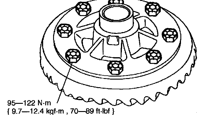 1) Position the ring gear and then start two or three ring gear bolts to align the holes in the ring gear and the differential case.