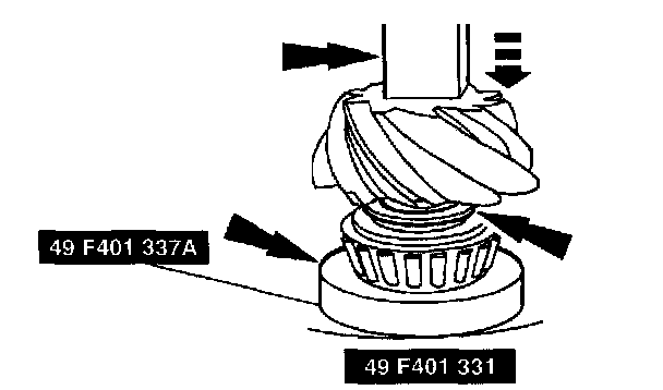 2) Use Bearing Installer Set ST 49 F401 331 and Attachment C ST 49 F401 337A to press the differential pinion bearing until it is firmly seated on the pinion and pinion position shim.