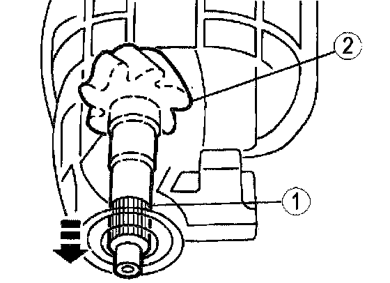20. Remove the oil slinger (1) and the differential pinion bearing (2).