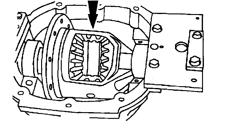 2) Lower the differential case in place between the differential bearing shims.