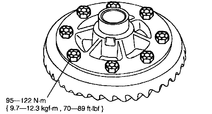 1) Position the ring gear and then start two or three ring gear bolts to align the holes in the ring gear and the differential case.