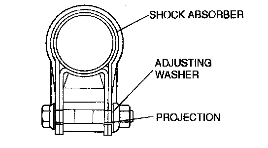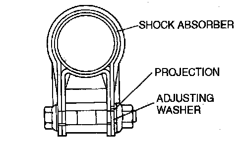 ^ In case of adjusting to + (positive) side, install the adjusting bolt and washer so that the projection of the washer faces inside (shock absorber side) as shown.