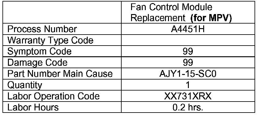 CONDITION OF CONCERNIt is possible the soldering strength on a terminal in the fan control module may be insufficient, causing a crack during use. If this failure occurs, the cooling fans may stop operating, causing the coolant temperature to rise, or the cooling fans may continue operating and may drain the vehicle's battery.