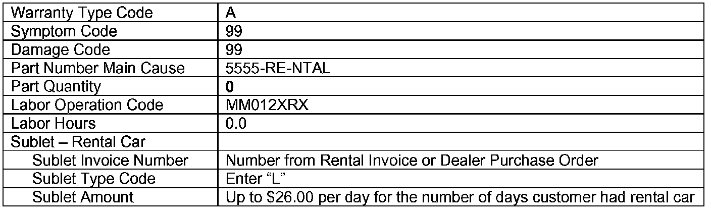 A rental car may be provided to the customer if eligible based on the terms and conditions of the Rental Car Reimbursement Program, policy 12.0. Rental car reimbursements are available only on 2001 and newer vehicles within the mileage and time limitations under the New Vehicle Limited Warranty. If the customer was placed in a rental car while the campaign was being completed, submit a separate claim/problem using the standard rental claim information. Rental expenses that exceed the two-day limit will require prior DCSM Authorization, as outlined in the Rental Car Reimbursement Program policy.