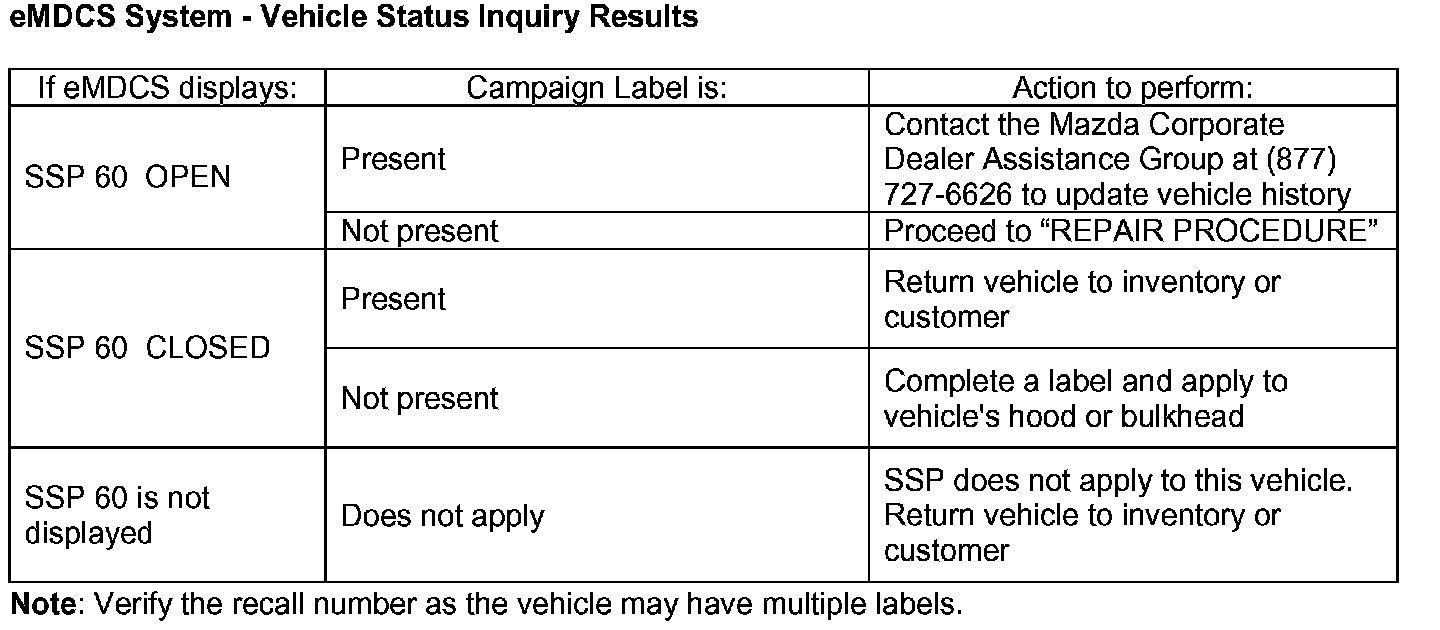2. Perform a Warranty Vehicle Inquiry using your eMDCS System and inspect vehicle for an Authorized Modification Label SSP 60 attached to the vehicle's bulkhead.
