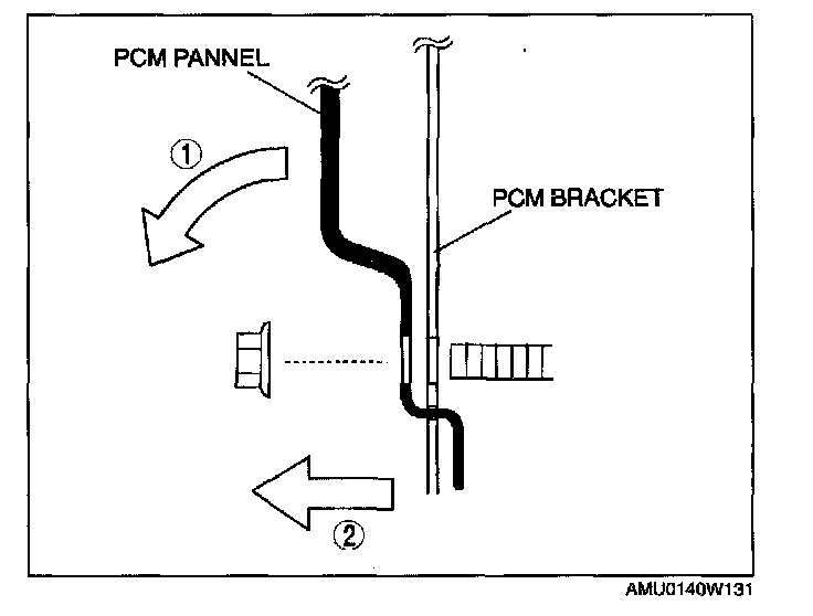 1. Before removing the PCM panel, pull the PCM connector harness stay fastener out from the PCM panel.
