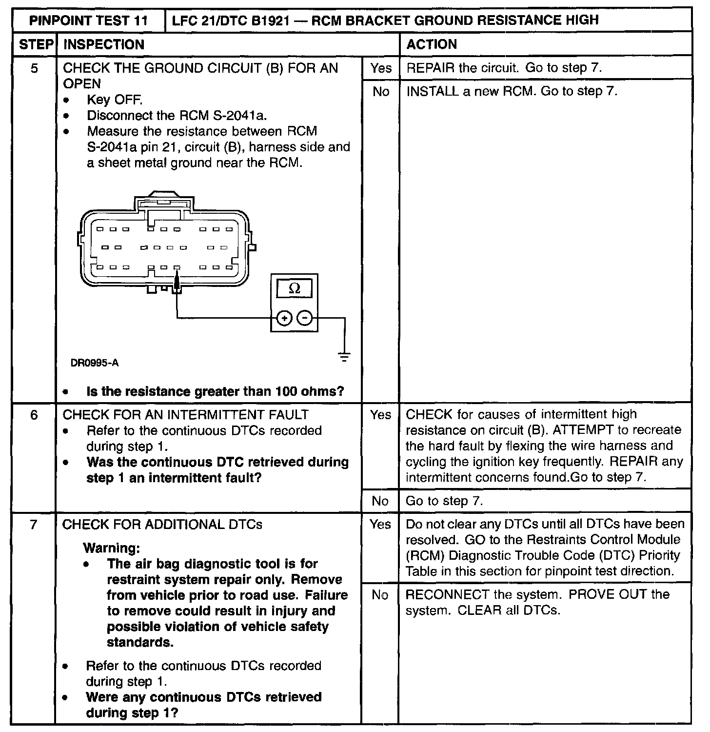 Pinpoint Test 11: LFC 21/DTC B1921 - RCM Bracket Ground Resistance HighNormal Operation