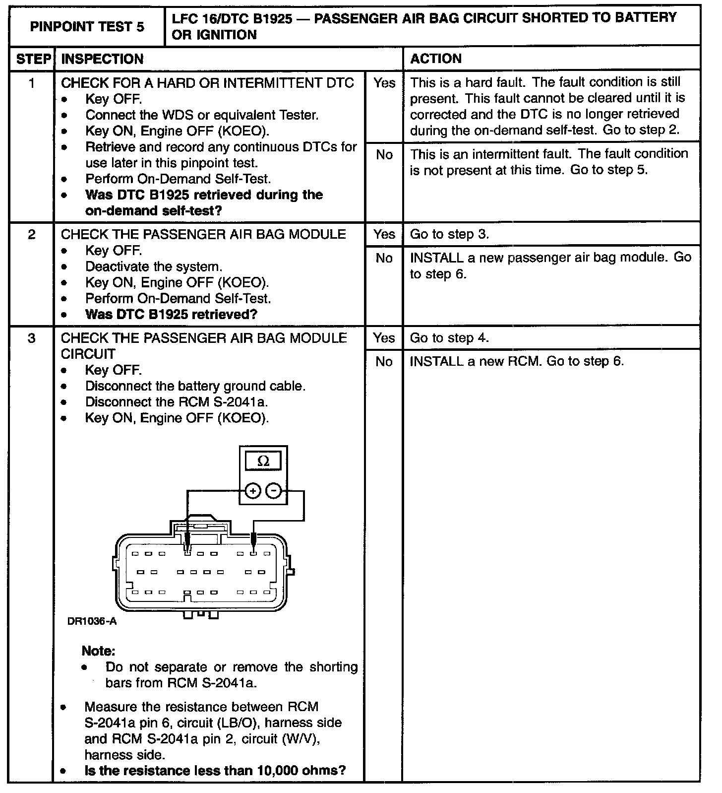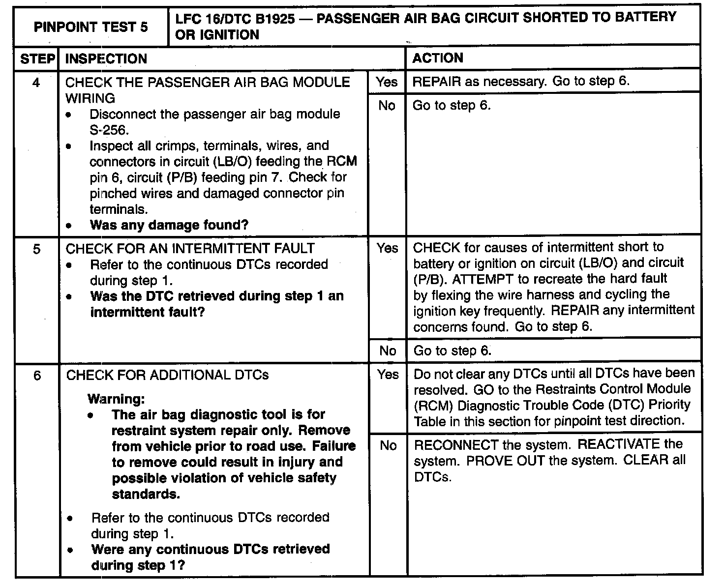 The restraints control module (RCM) checks for passenger air bag circuit shorts to battery or ignition by monitoring the voltage of circuits (LB/O) and (P/B) at pins 6 and 7. If the RCM detects a short to battery or ignition on either of these pins, it will store a diagnostic trouble code (DTC) B1925 in memory and flash a lamp fault code (LFC) 16 (or higher priority code if one exists) on the air bag indicator.